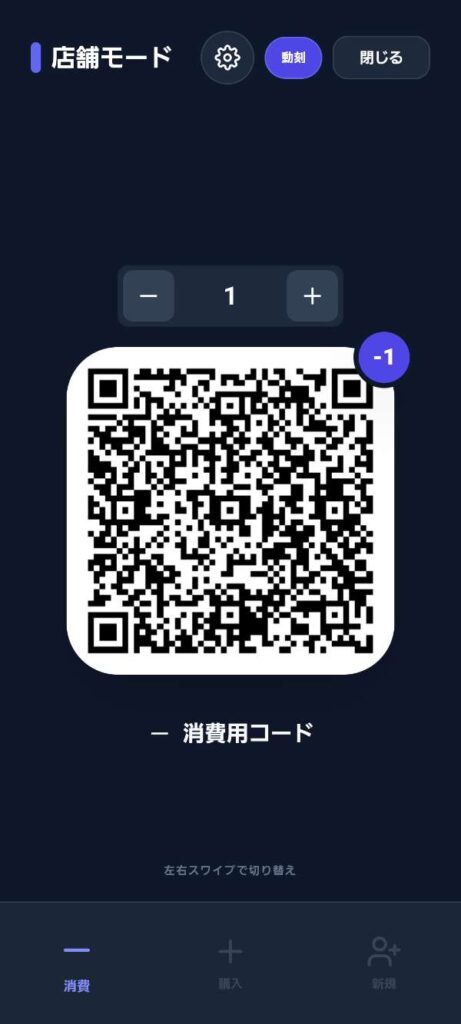 回数券を追加購入された場合、店舗モードの 「購入」タブ にあるQRコードを提示してください。