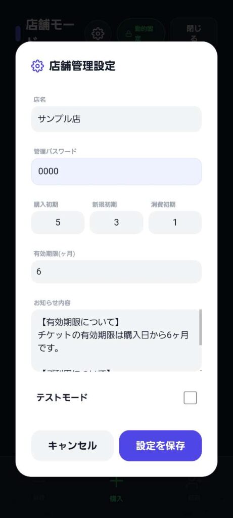 • 各初期枚数: 購入時や新規登録時に渡すチケットのデフォルト枚数を設定します。